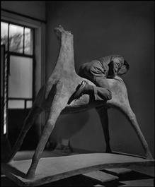 ITALY. Milan. Italian sculptor, Marino MARINI, in his studio on one of his horses. 1952.