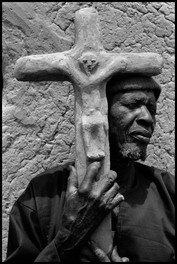 MALI. Dogon country. 1996. Village of Bugudunjuru. A Christian holds a crucifix made in the Dogon style.