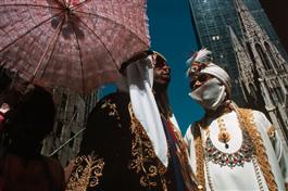 USA. New York City. 1983. Men dressed in costumes in front of St. Patrick's Cathedral on Fifth Avenue for the Easter Parade.