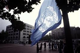USA. California. San Francisco. 1995. The UN flag raised at the...