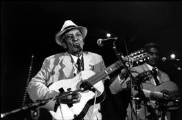 FRANCE. Picardie region. Somme department. Amiens. Maison de la culture d'Amiens, 1 place Léon Gontier. Amiens Festival "Musiques de Jazz et d'Ailleurs", 15th edition. From left to right : Cuban musicians Maximo Francisco "COMPAY SEGUNDO" REPILADO (guitar lead, vocal) and Benito SUAREZ (guitar). Concert. COMPANY SEGUNDO Y SUS MUCHACHOS. Wednesday, May 29th 1996.