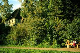 Germany, Weimar. Visitors on a bench beside the poet Goethe's garden house in the park running alongside t