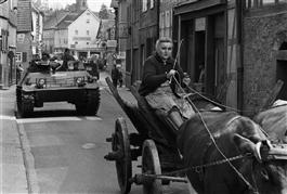 Neustadt, Germany. A tank from the German army driving through the streets of Neustadt, a town in Hessen. A woman is riding in an ox cart in the foreground.