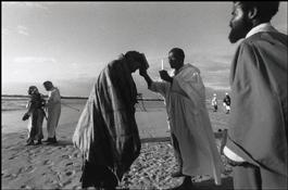 SOUTH AFRICA. Cape Town. 1999. After having been baptised through immersion into the sea, a newly convert is blessed by a Zion priest. Another faithful prepares to be baptized.