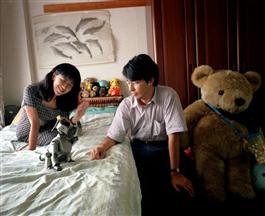 Japan: Artificial Intelligence Robot (AIBO) Made by Sony. Dr. Tsuchiya and his wife Yuki at home with AIBO. 1999.