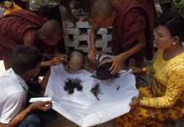 MYANMAR (Burma) Young boys, after the age of 7 spend a short time during a school holiday as novice monks. Their inititation is a lengthy ceremony over 2 days. On the first, they are dressed and made-up and paraded round pagodas where offerings are made. On the second they have their heads shaved and are given monk's red robes and a collecting bowl. 1995