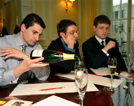 GB. ENGLAND London. Butler School. Demonstration at Moet and Chandon - butlers pour their own glasses of Champagne and discuss.
