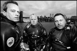 USA. New York City. 1999. NYPD scuba divers on the East River. Cummings, far left, is in charge of the Scuba Unit. Collins and McLaughlin have logged 42 years of scuba service between them.