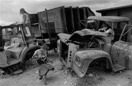 EL SALVADOR. Soyapango. 1991. Resident children of the San Salvador city dump play together with a pet puppy in abandoned and junked trucks.