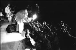 FRANCE. Occitania region. Gard department. Nimes. 9th edition of the International Jazz Festival. Blues Night. From left to right, the US jazz musicians Edgar SYNIGAL (saxophone) and B. B. KING (vocals, guitar), and the concert spectator. During the concert. B. B. KING AND HIS ORCHESTRA. Saturday 21st July, 1984.