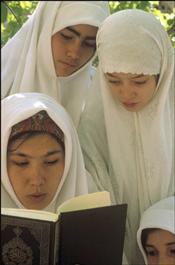 UZBEKISTAN. Bukhara. 1993. Students of the Jabar Kalan Medressa, the first Koranic school for girls where the islamic veil was imposed after independence from the U.S.S.R.