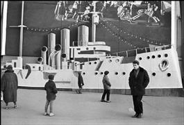 Illustration of the warship "Aurore", which says "Glory of the Great October", on the front of the cinema at Place l' Arbat.