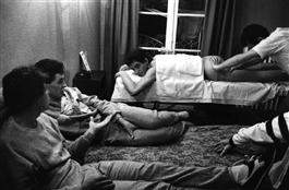 FRANCE. Provence-Alpes-Côte d'Azur region. Bouches-du-Rhône department. CYCLING TEAM RENAULT ELF. Domaine de Tournon. Massage session in the riders' rooms after a training ride, on the roads around Aix-en-Provence. From left to right: Pascal POISSON, Yvon MADIOT, Marc MADIOT. Thursday January 31st, 1985.