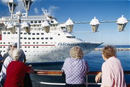 CARIBBEAN. Barbados. Cruise ship passengers on board the Saga Rose admire another cruise liner as they berth in Bridgetown. 1999