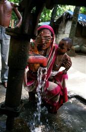 BANGLADESH. Jhikargachha, Krishnanagur District. Mother washes her baby and draws water for the family from a red-painted well indicating that the water is contaminated with arsenic. The village has no other source of pure water. 2000.