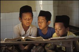 INDONESIA. Java. Gresik. Koranic school for boys in a mosque. They memorise the Koran in Arabic, a language they do not speak nor understand. 1989.