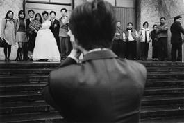 TAIWAN. 1998. Friends and relatives pose with a newlywed couple after a ceremony outside of a church in Taipei.