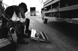 The Hong Kong Field Patrol Detachment is responsible for combatting illegal immigration, here at the Man Kam To checkpoint to place mirrors under trucks in search of Chinese illegal immigrants being smuggled into Hong Kong.