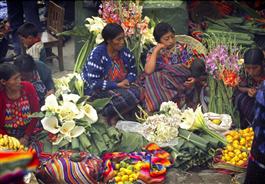 Guatemala, Chichicastenago, Quiche. Flower market on the steps...