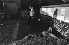 FRANCE. Seine-Maritime. Esteville. Abbé PIERRE, founder of the French charity organisation EMMAUS, which collects funds, food, and finds homes, to help the poor. He is seen here in the cemetery where he wishes to be buried in the grave with the other founders of EMMAUS and looks at a large crucifixion which was recuperated from a scrap heap during the collection of objects by the Emmaus organisation which they recycle or sell to scrap merchants. 9th January 1994.