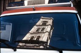 Italy, Florence: the reflection of the tower of St. Croce church.
