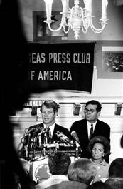 UNITED STATES. New York. 1968. 'Day of announcement at The Over Seas Press Club, RFK, Theodore Sorrenson, and Ethyl'.
