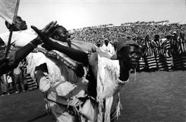 Afrique de l'Ouest. Mali. Bamako. Le stade Omnisport. La troupe traditionnelle "Le Badéma" avent le début du match de football, finale de la Coupe d'Afrique de l'Ouest des clubs, opposant le Stade Malien au New Nigerian Bank. Dimanche 7 octobre 1984.