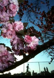 USA. NY. Central Park. 1991. Cherry blossoms, reservoir near jogging track.