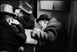 Jerusalem. 1957. In the Mea Shearim section of Jerusalem, this group meets for several hours every dayto haggle over various interpretations of obscure points of Talmudic scholarship.