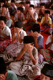 Indonesia. Sumatra. Near Sigli. Lok Kaju village. Young boys praying in Lok Kaju mosque.