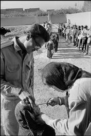Fakhri checks a little girl before going into school with an eye problem, most probably a trachoma.