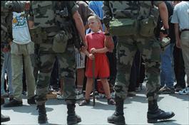 KOSOVO. Mitrovica. July 1999. Young boy watching arrival of UN representative Bernard KOUCHNER.