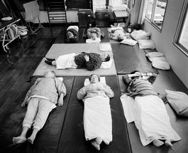 Japan. Minamata Bay. Patients at Meisui-en Hospital take physiotherapy heat treatment. 1991.