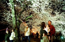 JAPAN. Kisuki. The town of Kisuki has been designated as one of the 100 best cherry blossom locations in Japan. 2000 trees are planted alongside the river and a festival is held there every year at the high of the season. People gather to watch a firework display. 2000.
