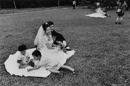 TAIWAN. 1997. Newlyweds pose for pictures after a group wedding in former President Chiang Kai-shek's garden, which is now open to the public.
