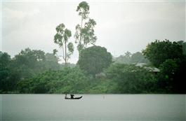 BANGLADESH. Small wooden water taxi ferries a passenger sheltering from the monsoon rains to another part of Khaliajuri village in north east Bangladesh. 2000.