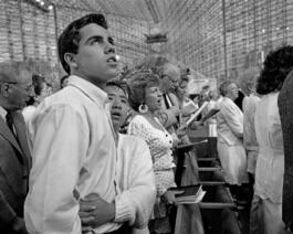 The "Electronic" church of Doctor Schüller, The Crystal Cathedral. The organ player's birthday is celebrated by showing pictures of his life on the giant Sony Jumbotron screen. The services are taped and sold to many TV stations all over the world (even in Russia now).