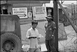 Long Binh, near Saigon. This camp is one of the main gates and everybody coming here is searched for drugs. Posters warning that the possession of narcotics and marijuana is illegal.