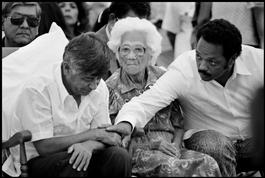 1988. UFW President Cesar Chavez, his mother Juana Estrada Chavez, and Jesse Jackson at the service during which Chavez ended his 36-day hunger strike and Jackson took his up.