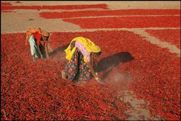 INDIA. Near Udaipur, in Rajasthan. Women spread out red peppers...