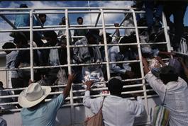 Altamirano. Displaced campesinos rush to board a truck to get back to their villages.