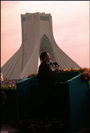 IRAN. Tehran. Anniversary of the Islamic Revolution on February, 10 in Azadi square. Iranian President Mohammad KHATAMI making a speech. In the background, the Azadi Tower, formerly known as Shahyad Monument. 2001.