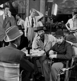 FRANCE. Paris. On the right: Jose FERRER as Toulouse Lautrec and, next to him, Christopher LEE. In the foreground: John HUSTON, during the filming of the movie "Moulin Rouge", by John HUSTON, starring Zsa-Zsa GABOR, José FERRER, Suzanne FLON, Christopher LEE, and Colette MARCHAND.