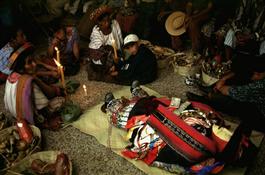 Guatemala, Maya. Santiago Atitlün. Maximon cult during Holy Week. Maxim_n lies at state in city hall befor