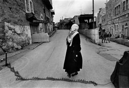PALESTINE. Hebron. 1997. A Palestinian woman walks over a spike...
