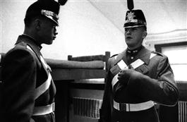 Philadelphie. A last minute inspection from his barracks leader for Cadet S. Rylski (futur King SIMEON of Bulgaria), at Valley Forge Military Academy.