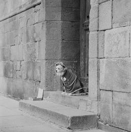 SPAIN. Galicia. Outside the Cathedral of Santiago de Compostela, a dog is dressed up to raise money from tourists. 1998.