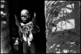 MALI. Village of Senedongo. 1996. A Dogon Christian boy prepares a fowl for cooking. Animal sacrifices are part of Dogon animist rituals.