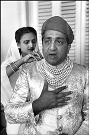 INDIA. Gujarat. Baroda (Vadodara). 1948. Festivities for the 39th birthday of the Maharajah. The Maharani arranges the Maharajah's pearl necklace.