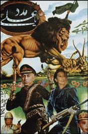 PAKISTAN. Punjab province. An electoral poster shows PPP (Pakistan People's Party) Chairwoman Benazir BHUTTO with her father the former Prime Minister Ali BHUTTO as warriors.